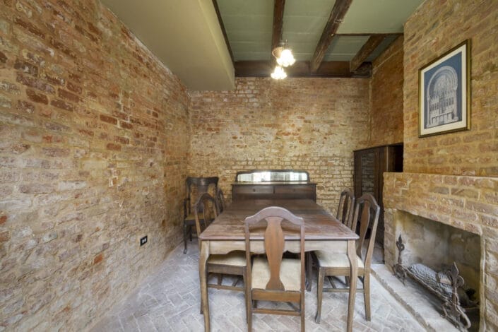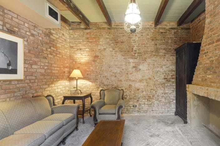 The kitchen, expanded into the historic loggia, showcases early 1800s floor tiles imported from Provence and custom mahogany cabinetry built on-site. Antique Murano glass chandeliers adorn the living room, dining room, and guest bedroom, while the upstairs living area includes built-in mahogany cabinetry, a hidden TV lift, and audio system.